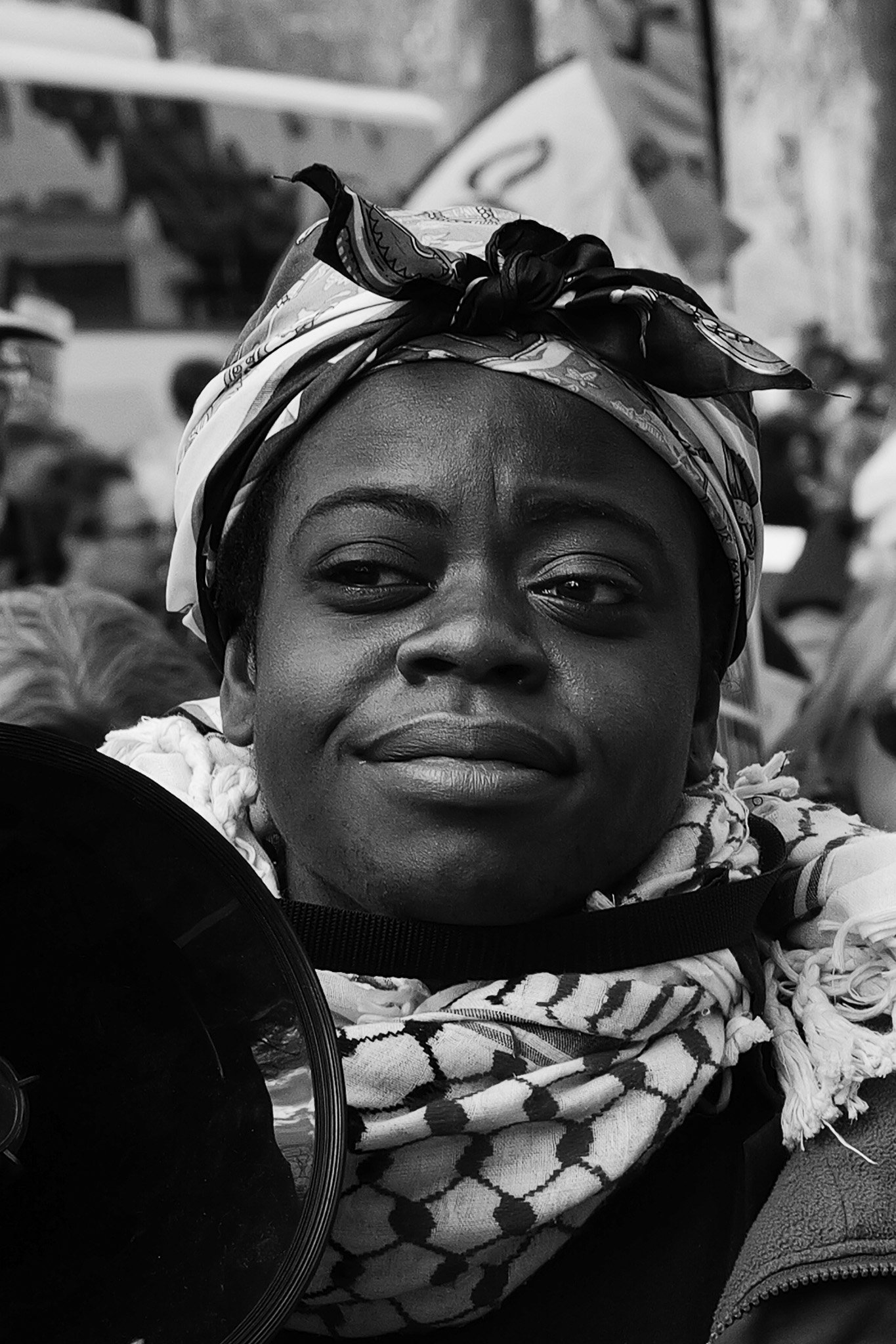 Take the woman with the megaphone, shot with the 43mm for instance. She looked really calm and content just standing there waiting for things to start. For this shot, I was able to significantly punch in and had a lot of latitude with the framing.
